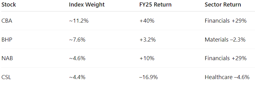 Four stocks (CBA, BHP, NAB, and CSL) represent nearly 30% of the ASX 200. Their individual performance has outsized effects on index-level returns.